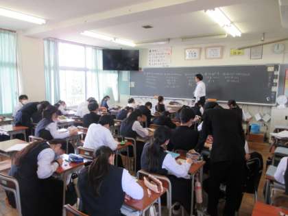 写真下:3年2組 数学の授業風景です。因数分解の問題に取り組んでいます。