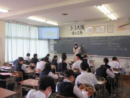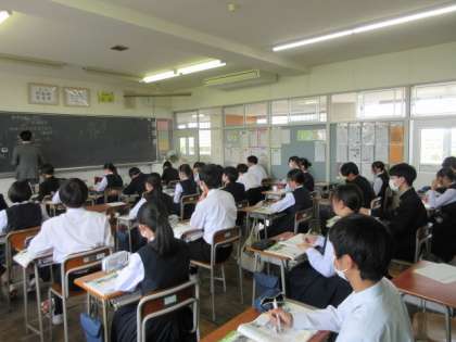 写真下:3年4組 社会の授業風景です。歴史の授業が行われています。