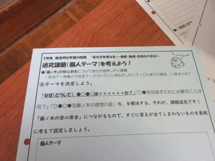 今年度の1年生の総合的な学習の時間のテーマは、「生き方を考える 〜他者・地域・社会から学ぶ〜」です。1学期は「『安心安全な藤ノ木』のためにできることを見つけよう」という課題で、追究学習を行います。