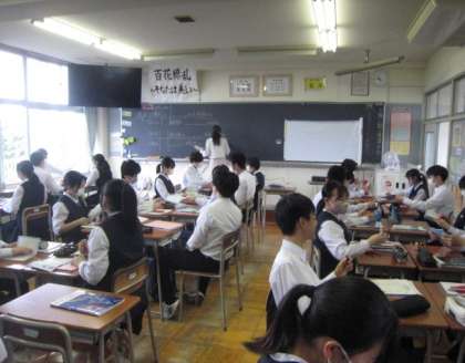 上:3年1組 英語の授業風景です。活発なグループワークを行っています。