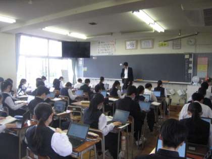 下:3年2組 社会の授業風景です。クロームブックを使い、これまでの学習内容を復習しています。