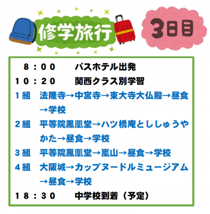 5月31日(金) 修学旅行3日目の予定 公開日 2024/05/31 更新日 2024/05/31 3学年 いよいよ修学旅行も最終日を迎えました。今日はクラス別行動が中心の一日です。最後の一日、めいいっぱい学んできてください!