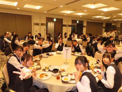 修学旅行3日目の朝を迎えました。朝食会場の様子です。みんな疲れを感じさせないくらい元気です。
