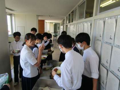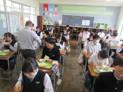 3年生はスピーディに配膳して、いただきます。今日のメニューでは、チリコンカンが人気のおかわりメニューでした。