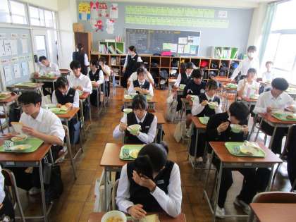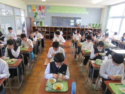 3年生はスピーディに配膳して、いただきます。今日のメニューでは、チリコンカンが人気のおかわりメニューでした。