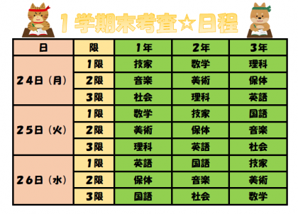 6月22日(土) 1学期末考査の予定 公開日 2024/06/22 更新日 2024/06/22 news いよいよ来週から1学期末考査がスタートします。週末の時間を学習に当て、有意義な時間を過ごしましょう!