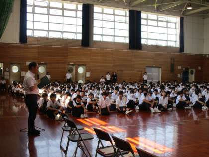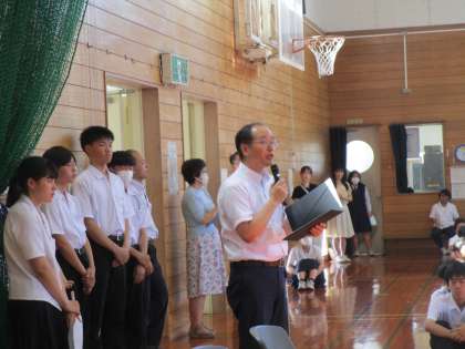 7月4日(木) 県中学校総合選手権大会・県民体育大会・吹奏楽コンクール壮行会 公開日 2024/07/04 更新日 2024/07/04 news 吹奏楽部の演奏の後、校長先生から激励の言葉がありました。