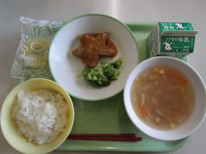 今日の献立は七夕給食でした。天の川に見立てた春雨スープ、星形のハンバーグと、目にも嬉しい献立でした。