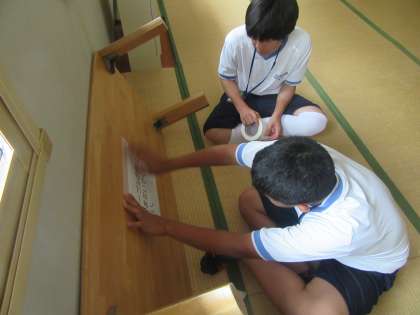 国立立山青少年自然の家での様子です。利用者が使いやすいように、テーブルに張り紙を貼っていました。