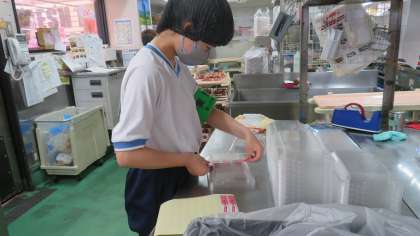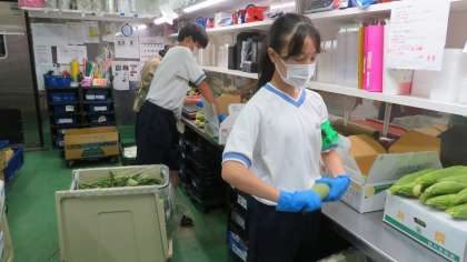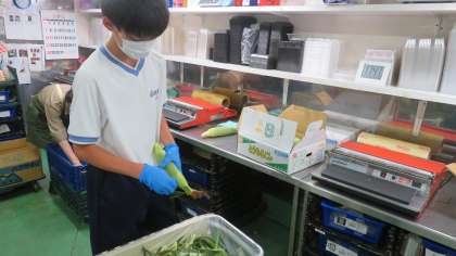 午前中はたくさんのトウモロコシの余分な皮やひげを取る下処理をしました。総菜部門ではトレイのふたに商品を紹介するシールを貼りました。