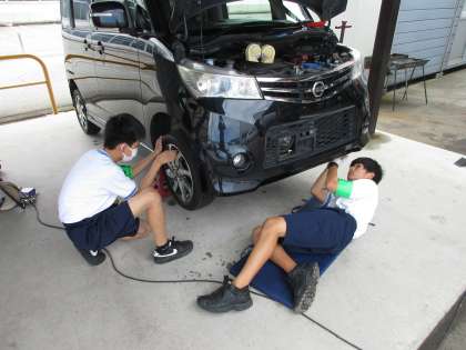 7月12日(金)2学年「社会に学ぶ『14歳の挑戦』」 公開日 2024/07/12 更新日 2024/07/12 2学年 ネッツトヨタ 会議の様子を見学し、勉強の大切さについて学んでいました。その後、お客様に出すコースター作りをしました。(写真上・中) カーメンテナンス 車の整備のために、タイヤを外したりフロントバンパーを外したりしていました。(写真下)