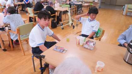7月12日(金)2学年「社会に学ぶ『14歳の挑戦』」 公開日 2024/07/12 更新日 2024/07/12 2学年 特別養護老人ホーム 三寿苑 最終日ということもあり、生徒の特技を利用者さんに披露しました。おやつにはお好み焼きをいただきました。