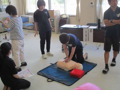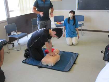後半の研修会では、心肺蘇生法とAEDの使い方について講習を受けました。万が一の時に備え、教員全員が人形を使って胸骨圧迫等のポイントを再確認しました。