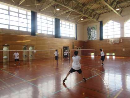上段:男子バドミントン部 ネットを挟んでシャトルを打ち合っています。