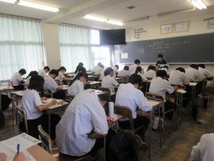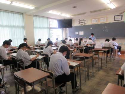 2学年は登校日です。提出物を回収後、英語と理科のテストに取り組みました。みんな真剣に受けています。残り3教科は、2学期に入ってから実施予定です。