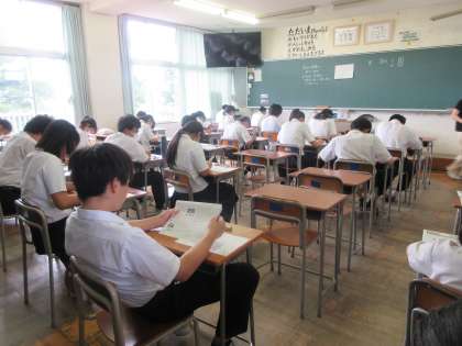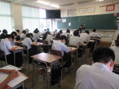 2学年は登校日です。提出物を回収後、英語と理科のテストに取り組みました。みんな真剣に受けています。残り3教科は、2学期に入ってから実施予定です。