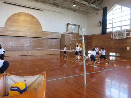上段:駅伝部 リレーをしています。 下段:バレーボール部 フットワークの練習をしています。