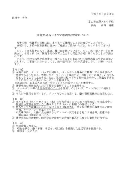 体育大会に向けての熱中症予防対策についてのお願い 公開日 2024/08/23 更新日 2024/08/23 news 9月4日(水)の体育大会までの熱中症予防対策についてテトルでも配信しましたとおり、ご配意ください。