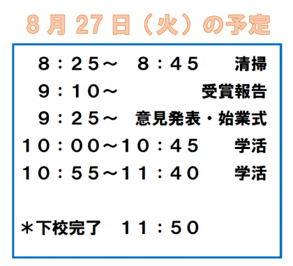 8月27日(火)の予定 公開日 2024/08/26 更新日 2024/08/26 news 明日からいよいよ2学期がスタートします。心も体も整えて、明日みなさんが元気に登校してくれるのを待っています!
