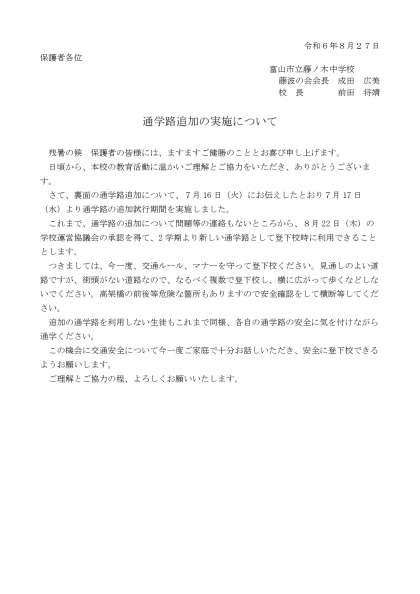 通学路追加の実施について 公開日 2024/08/27 更新日 2024/08/27 news 本日、通学路の追加についてのプリントを配布しました。これまで試行期間としていたあづまコンクリート横の舗装された道路を正式に通学路としてこれから利用していくことになります。これまで同様、安全に登下校できるようお願いします。