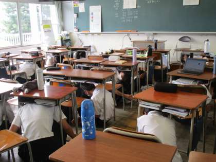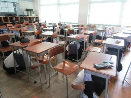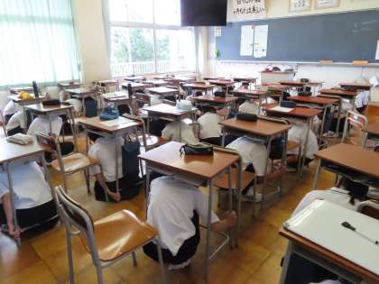 シェイクアウト訓練を行いました。地震を想定し、机の下にしっかりと頭を隠します。日ごろの備えが大切ですね。