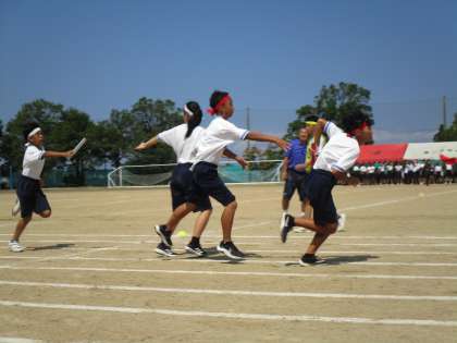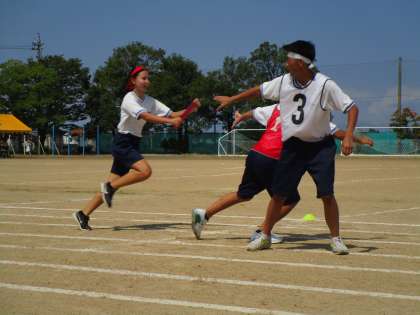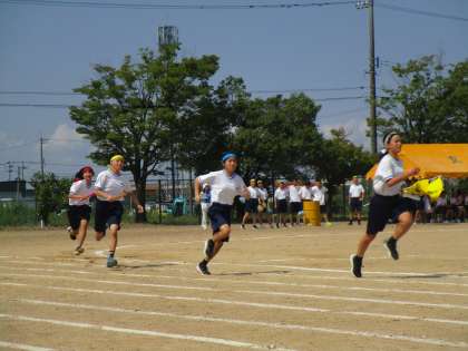 団対抗リレーは、白熱の戦いでした。どの団も団席から大きな声援がとんでいます。