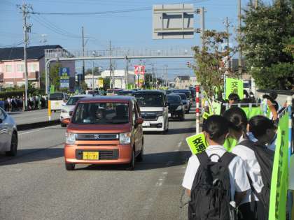 通学児童やドライバーに対して、藤木南交差点を起点に全校生徒が県道沿いに並んで、交通安全を呼びかけました。生徒はのぼり旗や手作りの横断幕を掲げ、元気に挨拶をしながら活動に取り組みました。