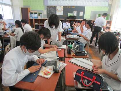 2年生の家庭科では、各自の目的に応じたMY BAGを製作しています。小学校以来の,ミシンの扱いに悪戦苦闘中です。友達同士教え合いながら進めています。
