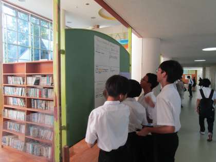 生徒玄関には、生徒会アンケートを掲示板を使って実施しています。みんなが思う回答をシールを貼って集計中です。