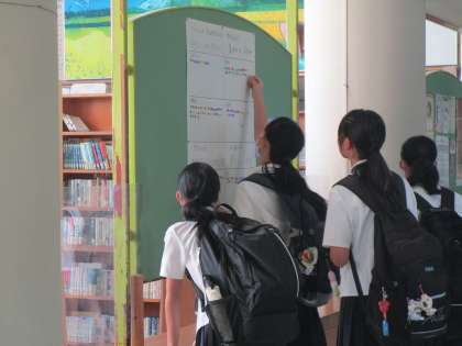 生徒玄関には、生徒会アンケートを掲示板を使って実施しています。みんなが思う回答をシールを貼って集計中です。