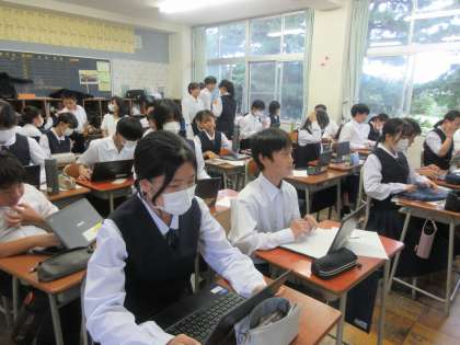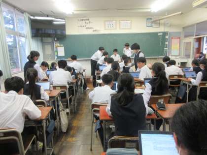 自分の設定した課題がどのように解決されたのか、みんなに伝えるための掲示物を一人一台端末を用いて作成しています。