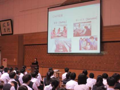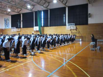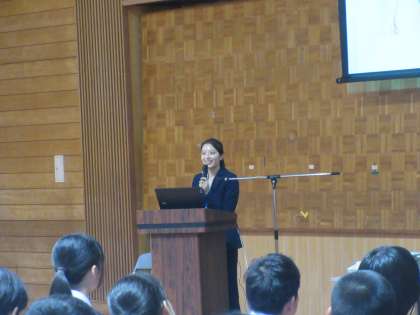 6限に先輩に学ぶ講演会がありました。富山地域づくりマネージャーの竹村和香奈さんを講師としてお招きし、社会の一員としてのマナーの大切さを学びました。身だしなみを整えること、明るく挨拶をすること等、実践を交えてわかりやすくお話いただきました。最後に、美しい立ち方やお辞儀の仕方を皆で練習しました。