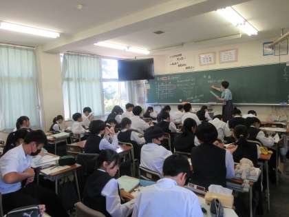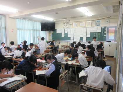 上は1組の国語です。話し合い活動をしています。 下は2組の数学です。解説を聞いています。