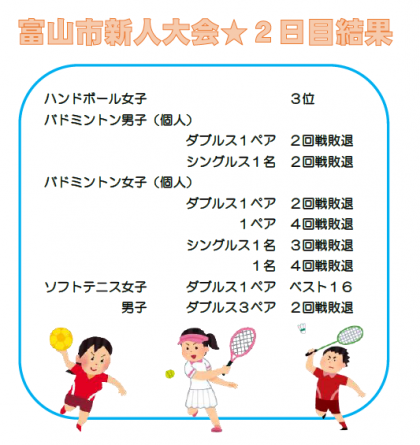 富山市新人大会2日目の結果です。どの部活動も健闘しました!