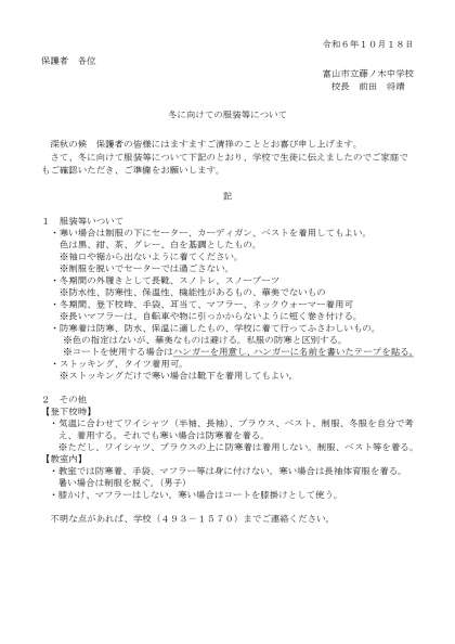 10月18日(金) 冬に向けての服装等について 公開日 2024/10/18 更新日 2024/10/18 news 本日、冬に向けての服装等についての保護者宛プリントをお子様を通して配布しました。冬に向けて準備のほど、よろしくお願いします。