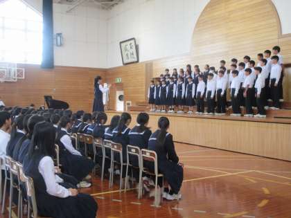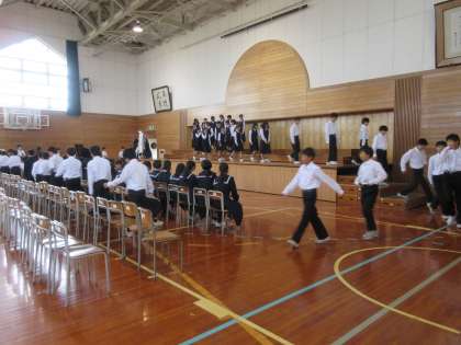 本番でスムーズに動けるように動きの確認をしたり、実行委員の放送練習をしたりしました。学年の生徒だけですが、観客がいる中で歌ったので、どのクラスも緊張している様子でした。