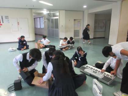 パートリーダーの生徒を中心に、合唱コンクールの練習で使用したキーボードやスピーカー、ラジカセ等の片付けを行いました。