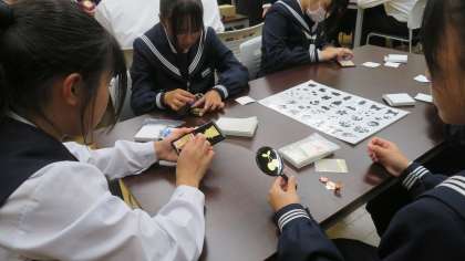 体験学習で、金箔貼り体験しているところです。 短時間できれいな作品が出来上がりました。。