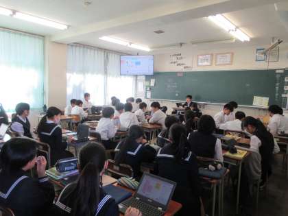 11月8日(金) 1年生 授業風景 公開日 2024/11/08 更新日 2024/11/08 1学年 上 1組 国語 説明的な文章を読む 下 2組 英語 fig jam を使って、文法を学習しています。