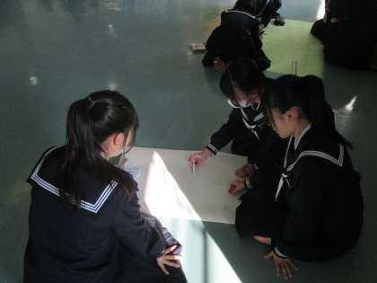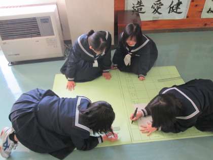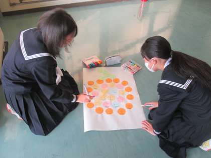 写真上・中:生徒会の活動の「玄関を明るくする運動」に向けて、各学年で掲示物を協力して活動しています。