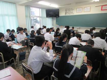今日は、「進路のしおり」を見ながら、今後の進路選択に関しての考え方や具体的な入試の方法等について学びました。