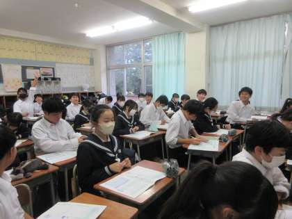 学年集会で、学年主任から学習の進め方について説明を受けました。