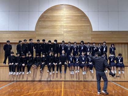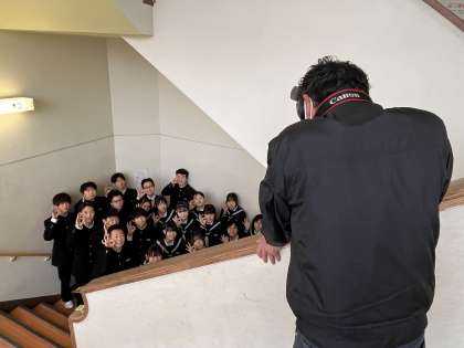 体育館や階段での集合写真、教室での姿の写真を撮影してもらいました。