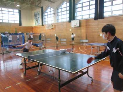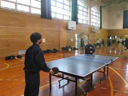 男女卓球部は、体育館の半面を使って、基本練習からスタートです。