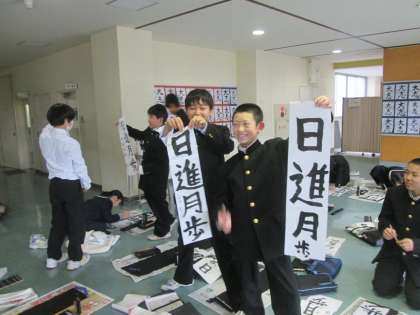 1年生は6限に書初練習をしました。教室の他、コモンスペースも使って広々練習です。