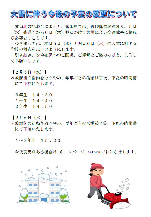 2月5日(水) 大雪に伴う今後の予定変更について