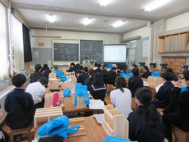 4組は技術の授業で、本棚の仕上げについて学んでいます。