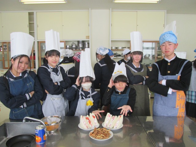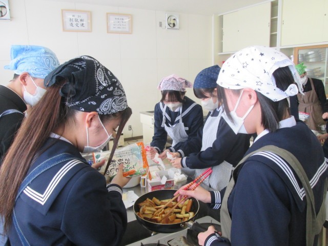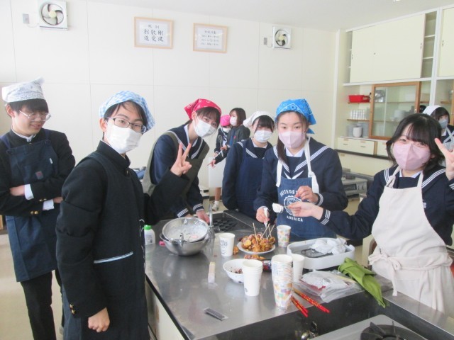 2月19日(水) 3年生 幼児が喜ぶおやつをつくろう 公開日 2025/02/19 更新日 2025/02/19 news 本日は、3年1組、3組が「幼児が喜ぶおやつ」を作りました。塩分を控えめにしたり、栄養バランスを考え、野菜を入れたり、盛りつけを楽しくするなど、幼児が喜ぶ工夫が多く見られました。 +1