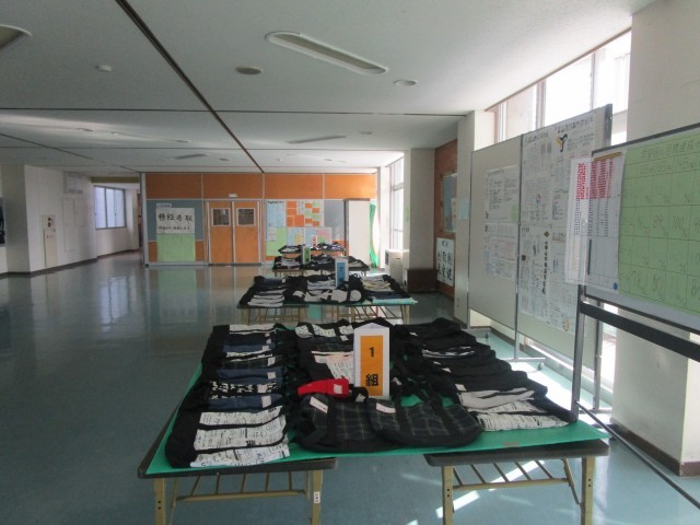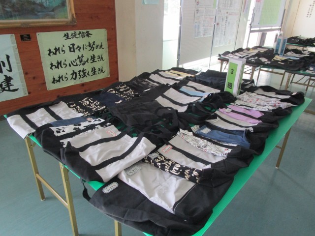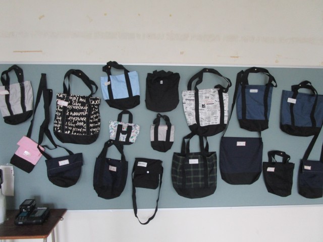 家庭科の授業で作製したマイバックをコモンスペースに展示してあります。