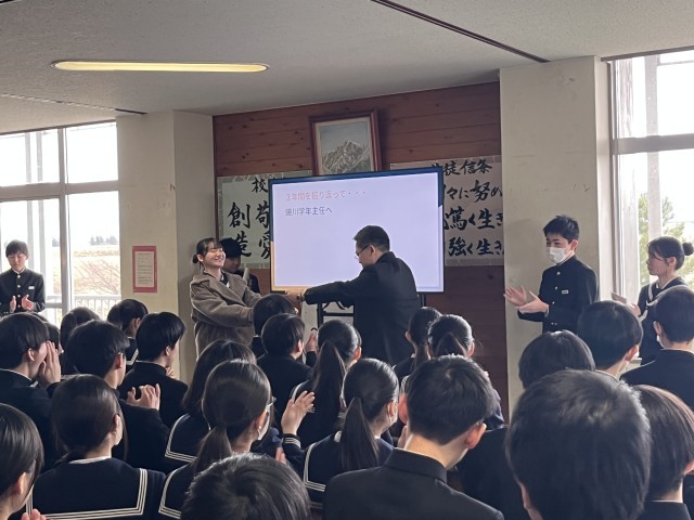 3月11日(火) 3年生 学年集会 公開日 2025/03/11 更新日 2025/03/11 3学年 3限に最後の学年集会を行いました。学年生徒会からは3年間を振り返る発表とスライドショーの披露がありました。その後、学年の先生方からの話を聞き、卒業に向けての意識や思いを高めました。 +2 3学年